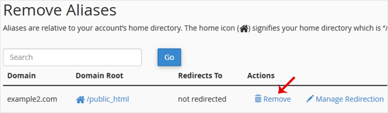 3. Under Remove Aliases, locate the parked domain name and click on Remove.