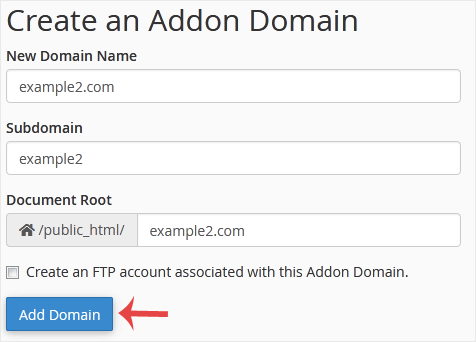 New Domain Name: Your Addon domain name, such as example2.com.