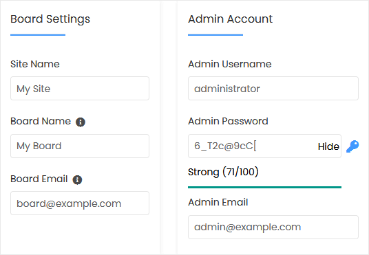 • Admin Username: Your new MyBB username (for security reasons, do not use the administrator or the admin username).